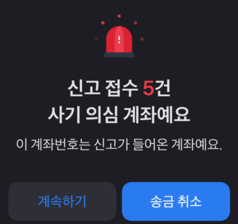 또는 직접 계좌 송금을 통해 거래를 한다면, 토스뱅크를 이용하는 것도 하나의 방법입니다. 토스에서는 입금하려는 계좌가 사기 신고 접수가 얼마나 발생했는지 알려주는 기능이 있습니다.