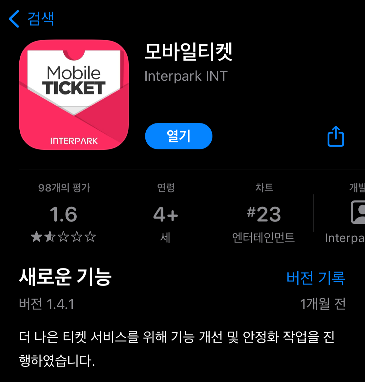 안전결제를 하거나 송금을 했다면, 이제 판매자에게 티켓을 받아야 합니다. 티켓 선물하기로 받으셨다면, 문자로 링크가 옵니다. 핀번호를 받았다면 인터파크 모바일 티켓 어플에서 직접 등록해야 합니다. 인터파크 모바일 티켓 어플은 아래와 같습니다.